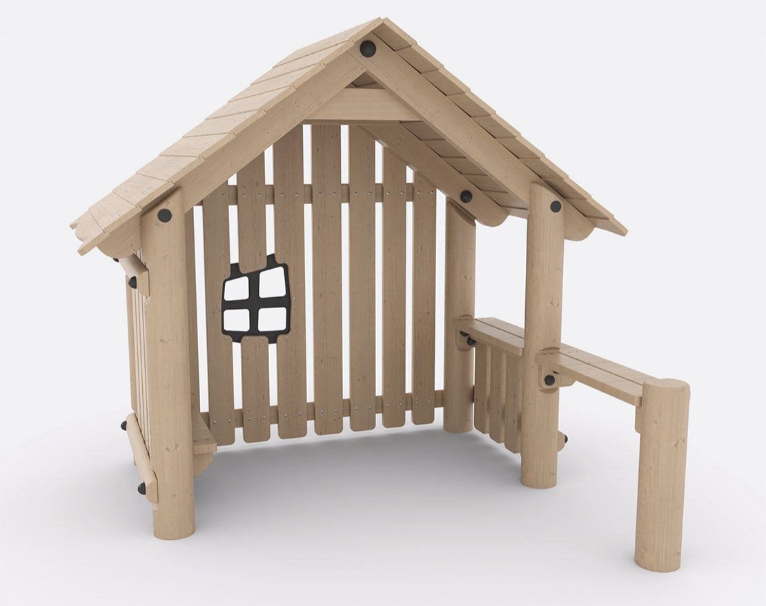 Состоит из опорных столбов и перекладин. Представляет собой домик с крышей, стенками с окном, скамейкой и столиком.