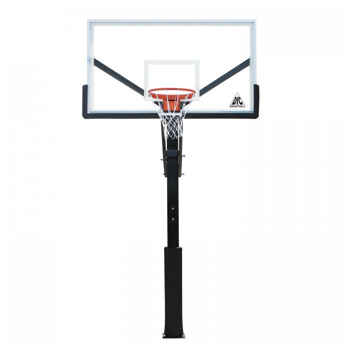 Щит изготовлен из закаленного стекла толщиной 10 мм и имеет размерность 180 х 105 см (72’’). По периметру щит имеет кант из металла. В нижней части щита и на стойке установлено защитное покрытие Poly Pade. Стойка комплектуется кольцом с амортизацией, которое выдерживает нагрузку до 300 кг в передней части. Бесступенчатая регулировка высоты с помощью ручки в диапазоне от 245 до 305 см.