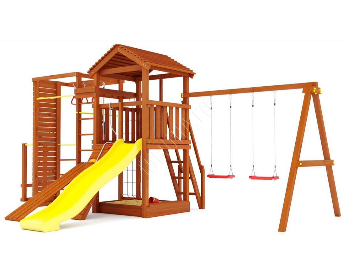 В основе натуральный материал – клееный брус 75х75 мм, изготовлена из безопасных материалов. Конструкция и элементы качельных подвесов разработаны и произведены согласно ГОСТ.
