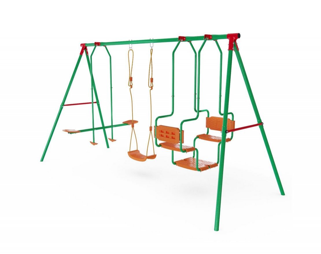 Устойчивость такой массивной конструкции достигается за счёт применения широкого профиля — 45×1,5 мм и 50,8×2 мм — который выдерживает нагрузку до 175 кг! Сиденья качелей имеют ребристую поверхность для предотвращения соскальзывания детей. Качели могут безопасно эксплуатироваться детьми от 3 лет.