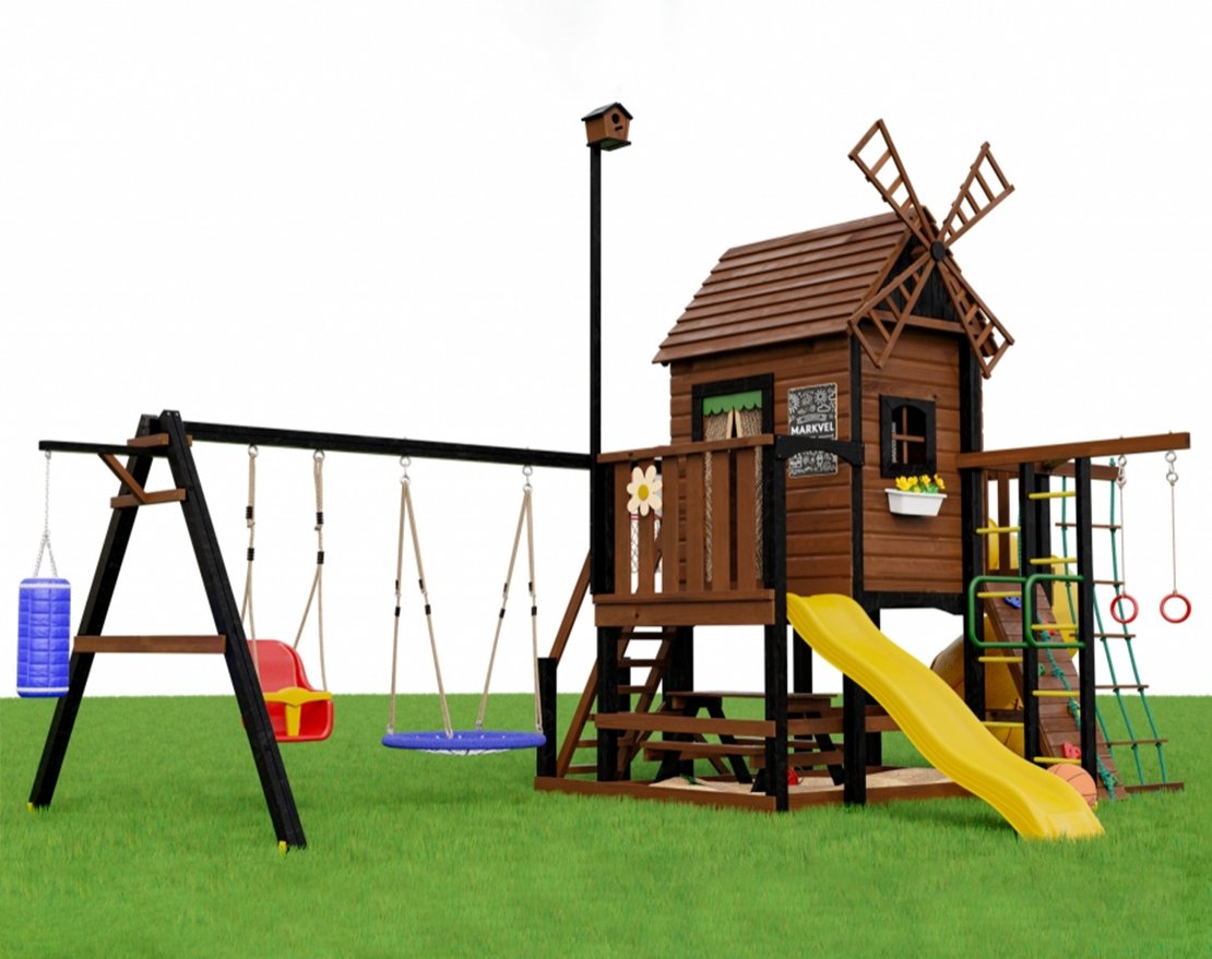 Игровой комплекс Мулен 5 — это уютный деревянный домик, наполненный атмосферой приключений. Его узнаваемый силуэт с декоративными лопастями на крыше перенесет детей в мир сказок, где можно представить себя отважным путешественником, хозяином мельницы или капитаном воздушного корабля. Площадка сочетает различные игровые и спортивные элементы, помогая ребенку развивать ловкость, силу и координацию. Лестницы, канаты, качели и горка превращают игру в увлекательное приключение, в котором важно не только фантазировать, но и двигаться. Внутри домика продумано всё до мелочей — каждый уголок наполнен возможностями для игры, творчества и удобства. На втором этаже маленьких художников ждет доска для рисования, где можно воплощать свои фантазии. Два отдельных столика со стульчиками позволяют детям играть, рисовать или устраивать чаепитие, не мешая друг другу. А просторная песочница под домиком станет местом для совместных экспериментов с песочными замками — здесь хватит места всем! Два раздельных входа делают пространство более просторным и удобным, создавая еще больше возможностей для веселой и динамичной игры.