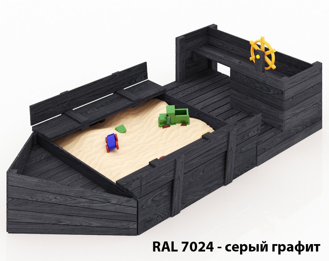 Детская песочница-кораблик и штурманская рубка со штурвалом.