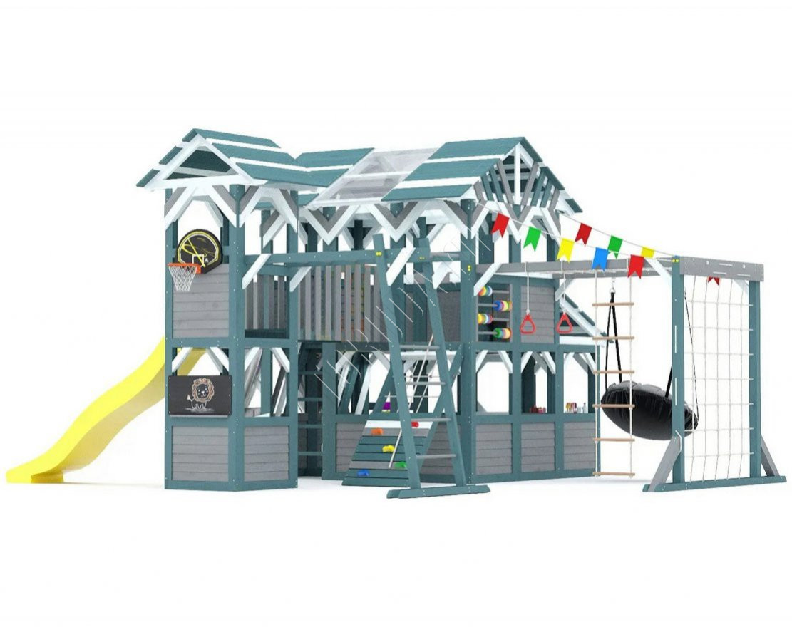 Этот комплекс сочетает в себе игровую и спортивную площадку, а также уютный детский домик с просторным игровым пространством. Он открывает двери в мир сказочных приключений для детей разного возраста (от 3 до 16 лет), развивая их физические способности и воображение.