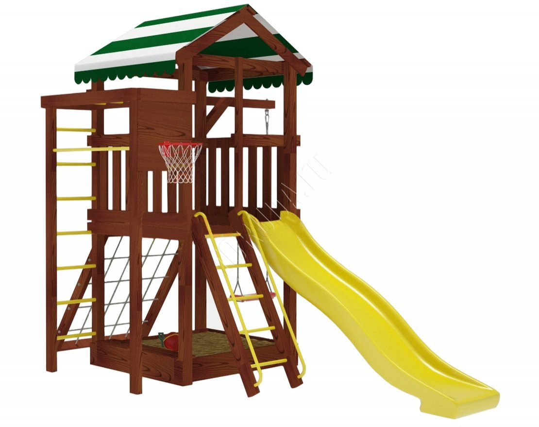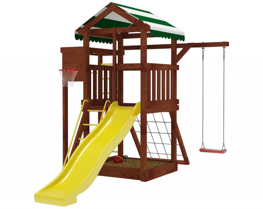 - Удобство для детей и родителей: конструкция продумана до мелочей: игровая башня с крышей защищает от солнца и осадков, песочница с лавочкой позволяет детям играть с комфортом, а баскетбольное кольцо со щитом добавляет разнообразие в игры.