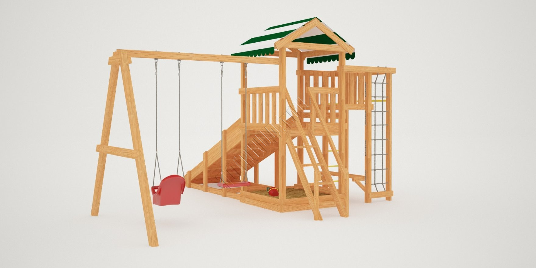 Конструкция сертифицирована и безопасна. Крепежи скрыты под хорошо закрепленными заглушками – поэтому даже малыши не поранятся. Каркас состоит из натуральных деталей – клееного бруса квадратного сечения со стороной 75 мм. Во избежание получения заноз и ссадин дерево отшлифовано, а края скруглены. Материал экологичен и не имеет лакокрасочного покрытия.
