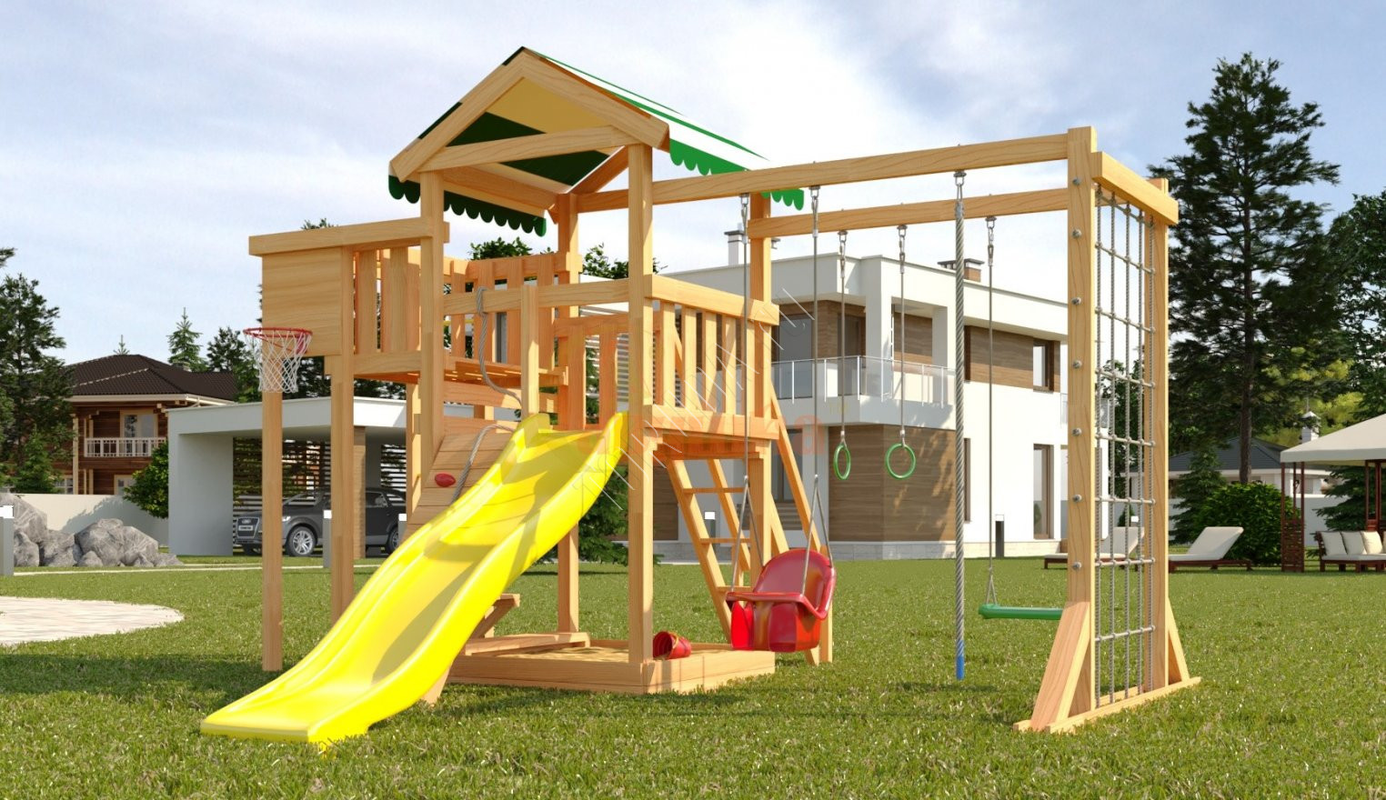 Укреплять мышечный каркас нужно с детства, бросая мяч в баскетбольное кольцо, вися на турнике и кольцах, карабкаясь по шведской стенке, канату, сетке-лазалке. Все это многообразие спортивных снарядов присутствует в этой площадке. Для большей радости качели «Лодочка» и «Люкс» со спинкой.
