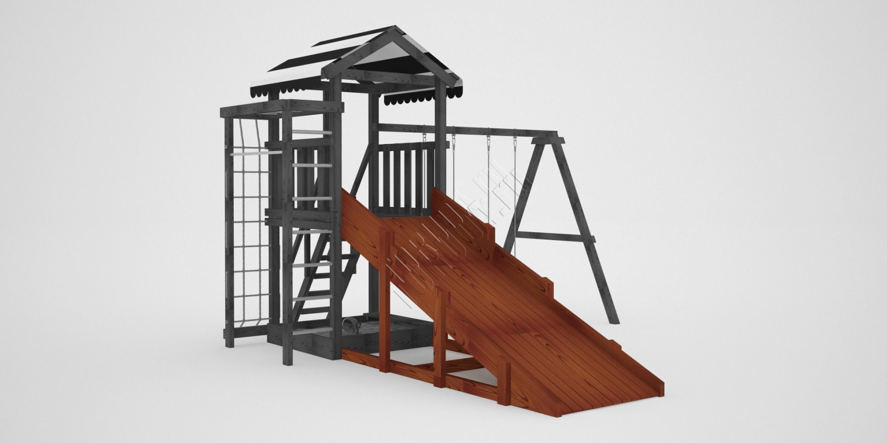 Конструкция, качество дерева и качельные подвесы соответствуют ГОСТ. Основной материал натуральный – это экологичный клееный брус, он гладкий на ощупь, его углы скруглены во избежание получения ссадин. Площадка полностью безопасна: все крепежи и болты плотно закрыты заглушками, а спортивное оборудование используется от проверенного сертифицированного бельгийского производителя.