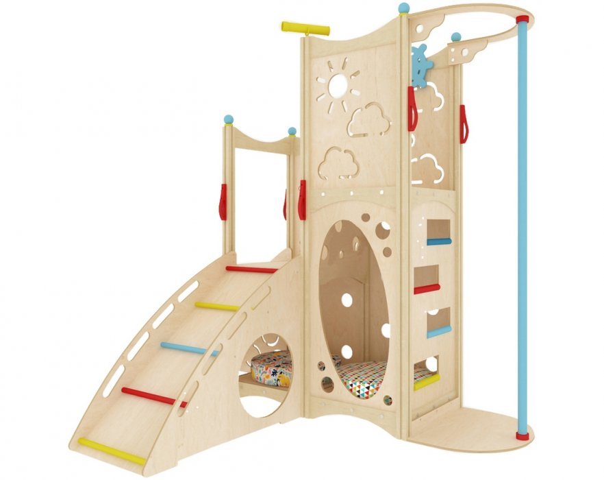 Особое внимание было уделено дизайну конструкции. Благодаря продуманному проектированию домик занимает минимум места и отличается функциональностью. Прямоугольные выемки могут выступать в качестве ступенек, через круглые отверстия малыши могут выбираться из домика, представляя, что преодолевают тяжёлый путь лабиринта.