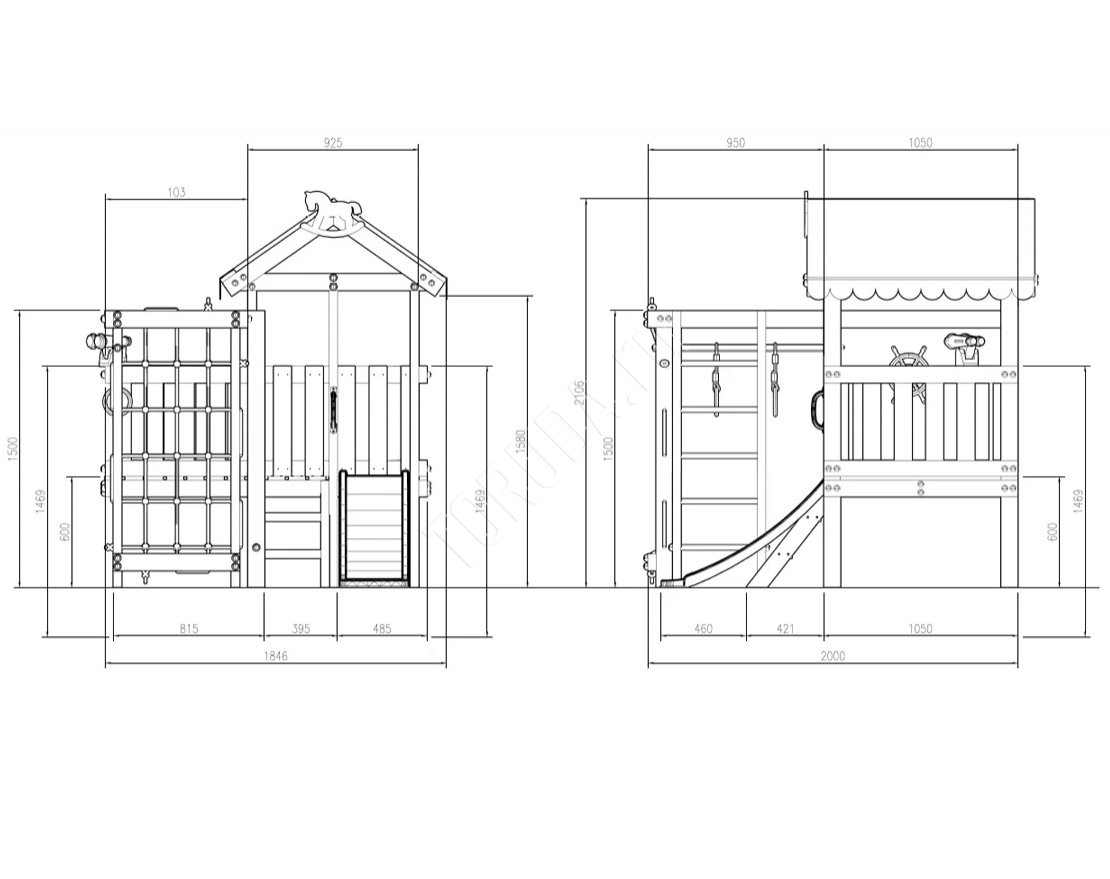 - Модель включает в себя три объединенных зоны: домик на платформе высотой 60 см, балкон и спортивный комплекс. Пространство под детской площадкой позволит хранить небольшие ящики. Ребёнок может положить туда мягкие игрушки, машинки, мячи и прочие предметы.