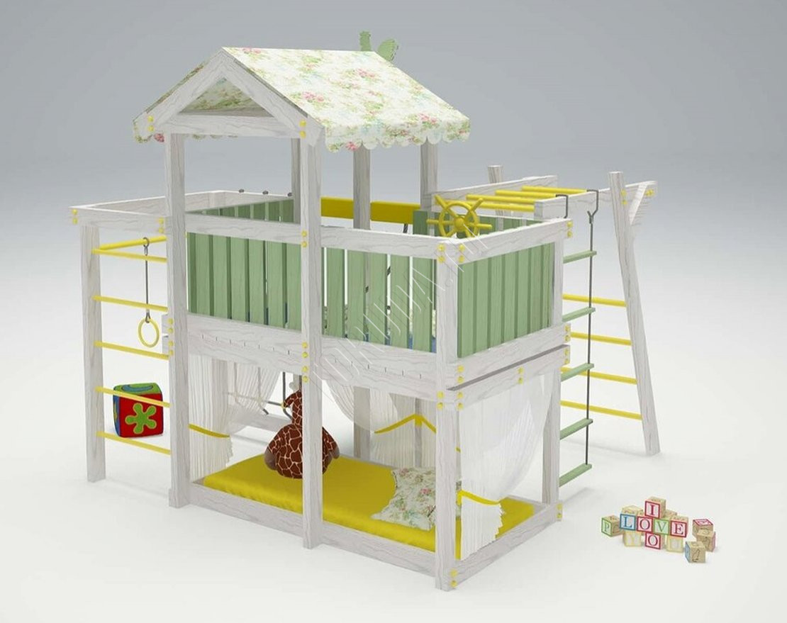 Двухъярусная площадка – разработана специально для большой семьи. Прочный каркас из массива хвойных пород выдержит нескольких детей.