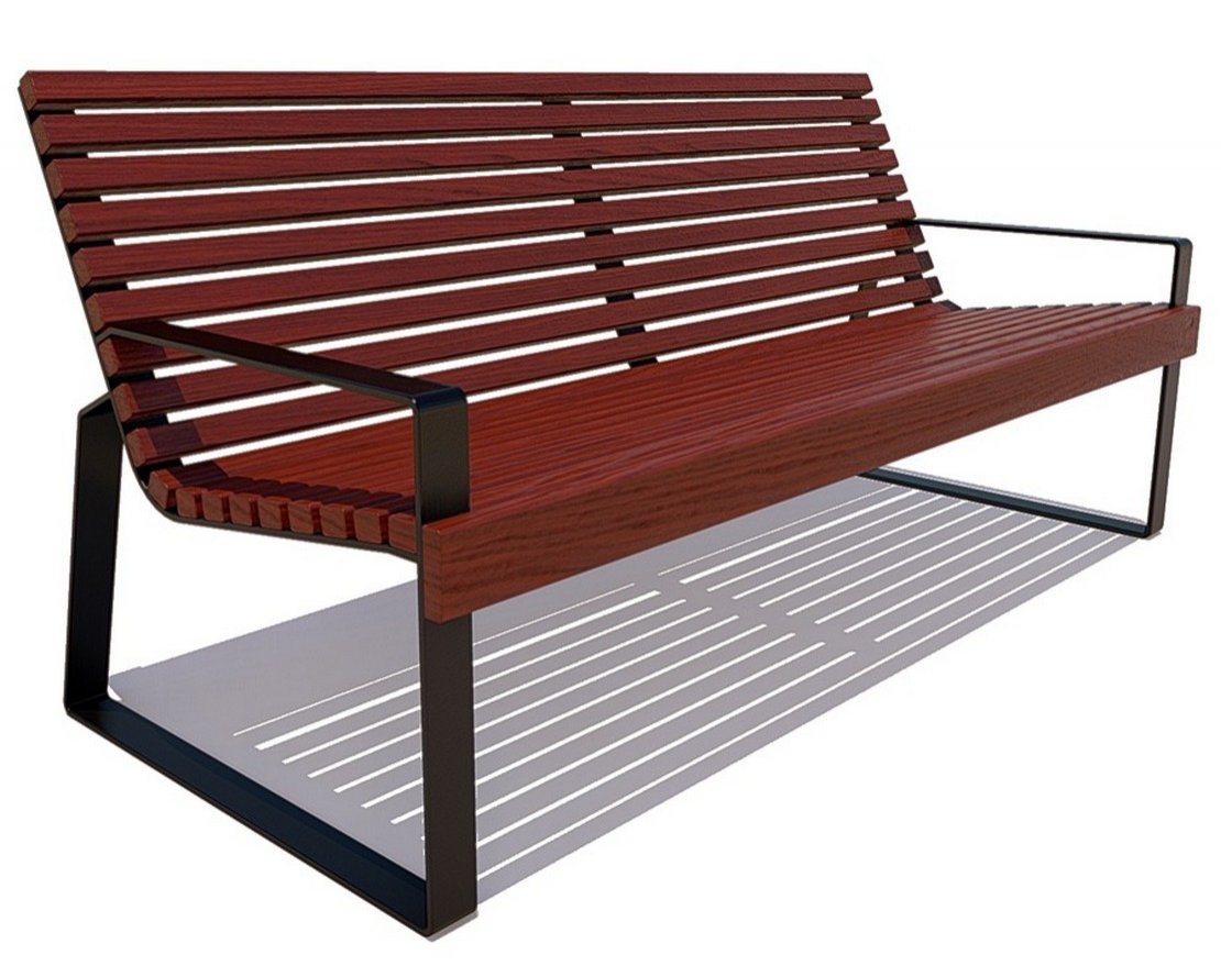 Скамейка Белгород в современном стиле. Минималистичные стальные боковины плавно перетекают в практичные подлокотники. Эргономичные спинки позволяют быстро расслабиться.