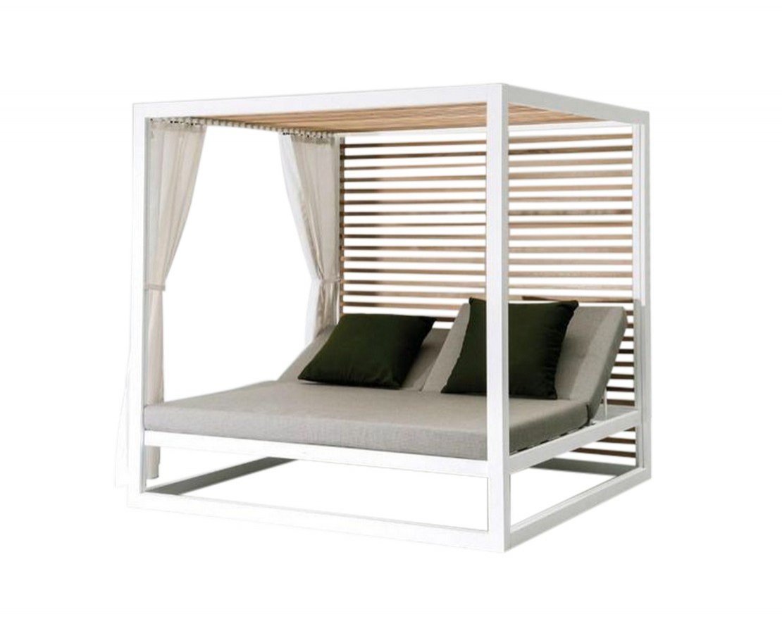 Пляжный лежак с матрасом и навесом в виде перголы, для обустройства пляжей и зон отдыха.