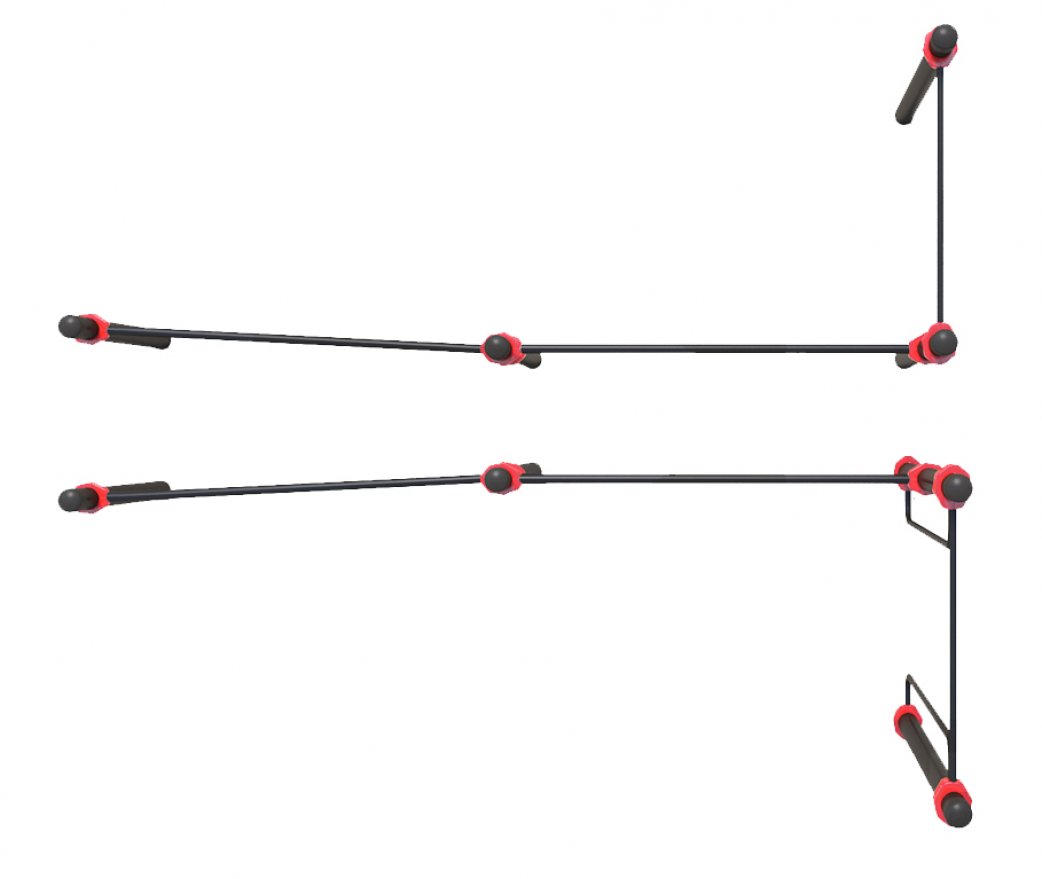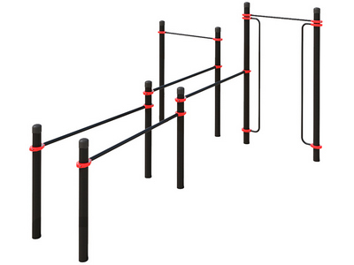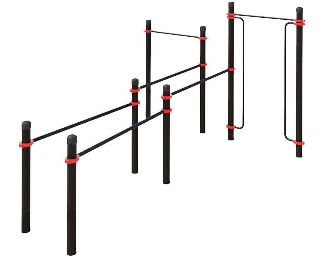Комплекс состоит из восьми опорных столбов высотой: 2 шт. - 2530 мм., 2 шт. - 2000 мм., 2 шт. - 1500 мм, 2 шт. - 1200 мм, двух перекладин для подтягивания длиной 1200 мм, параллельных брусьев и брусьев разношироких. Элементы крепятся к опорным столбам при помощи хомутов. Высота фиксации перекладин для подтягиваний: 1 шт. - 2300 мм, 1 шт. - 1800 мм. Жерди параллельных брусьев крепятся на высоте 1300 мм, расстояние между центрами опорных столбов брусьев 608 мм. Жерди брусьев разношироких крепятся на высоте 1050 мм от поверхности основания, расстояние между центрами опорных столбов брусьев: 608 мм - с одной стороны и 808 мм - с другой стороны. Комплекс оснащен поручнями для инвалидов-колясочников.